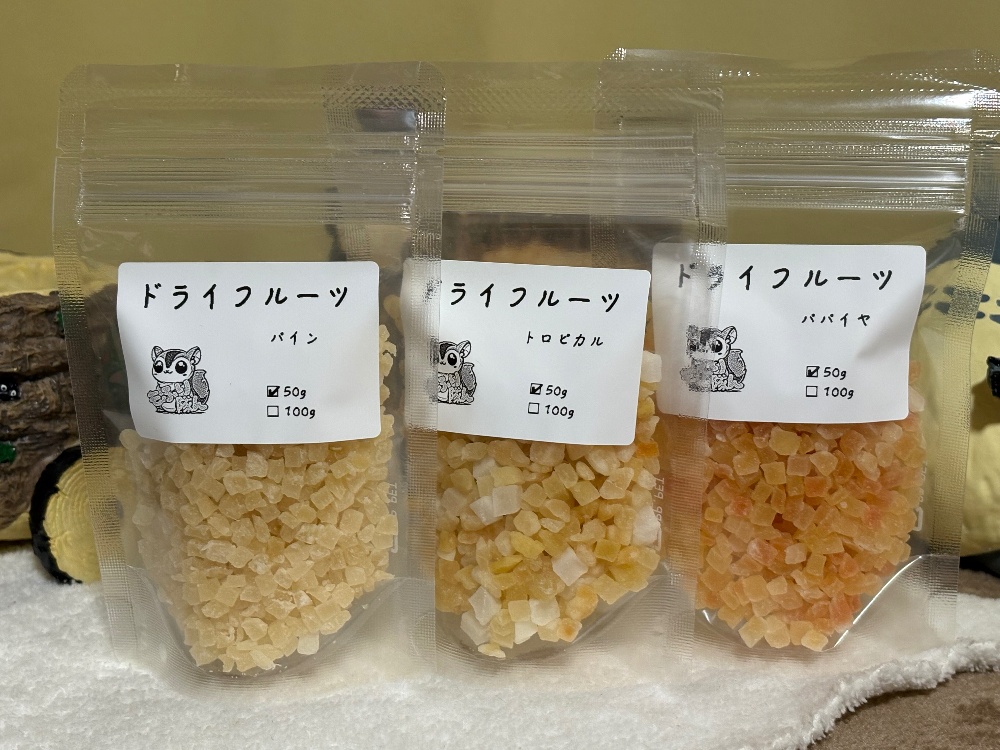 どれもモモンガやハリネズミが食べやすい5mmサイズのキューブのドライフルーツです。